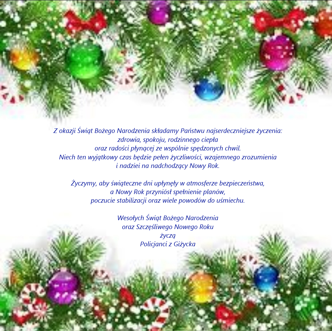 Życzenia świąteczne Policjantów z Giżycka Powrót Drukuj Wesołych Świąt Bożego Narodzenia życzą Policjanci z Giżycka