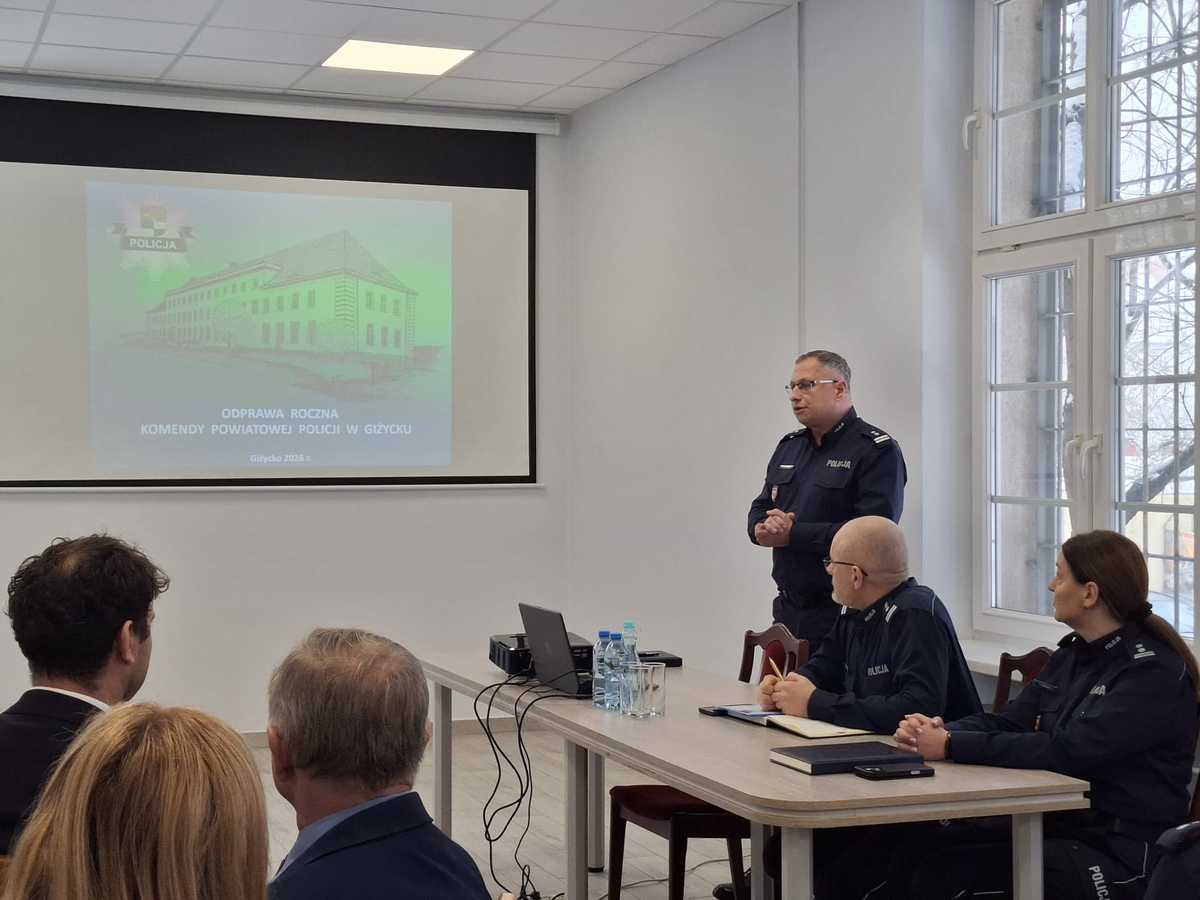 W siedzibie Komendy Powiatowej Policji w Giżycku odbyła się roczna odprawa podsumowująca działalność giżyckiej Policji. W wydarzeniu uczestniczył insp. Jarosław Brzozowski – Pierwszy Zastępca Komendanta Wojewódzkiego Policji w Olsztynie, kadra kierownicza, policjanci oraz pracownicy cywilni jednostki, a także przedstawiciele lokalnego samorządu, służb mundurowych i instytucji na co dzień współpracujących z Policją.