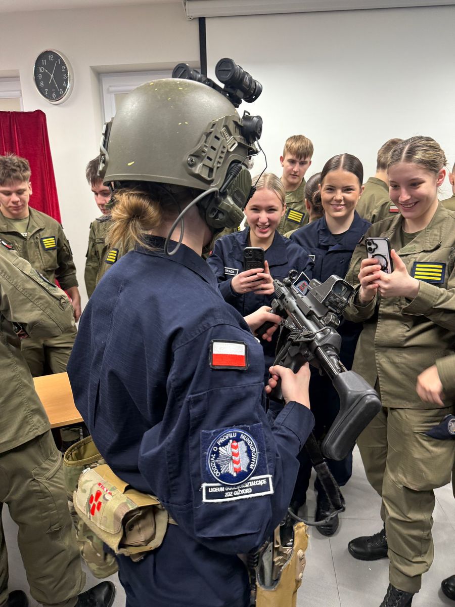 W piątek (13.02.2026 r.) policjanci z Komendy Powiatowej Policji w Giżycku spotkali się z uczniami klas mundurowych ZDZ w Giżycku. Celem wizyty było przybliżenie młodzieży specyfiki służby w Policji oraz omówienie poszczególnych etapów postępowania kwalifikacyjnego dla kandydatów do formacji. Podczas spotkania funkcjonariusze przedstawili codzienne zadania policjantów, wymagania stawiane kandydatom oraz możliwości rozwoju zawodowego w strukturach Policji. W wydarzeniu uczestniczyli również funkcjonariusze Samodzielny Pododdział Kontrterrorystyczny Policji w Olsztynie, którzy zaprezentowali specyfikę służby w pododdziale kontrterrorystycznym oraz omówili proces rekrutacji do tej wyspecjalizowanej jednostki. W spotkaniu udział wziął Komendant Powiatowy Policji w Giżycku mł. insp. Marcin Wysocki oraz Pierwszy Zastępca Komendanta Powiatowego Policji w Giżycku mł. insp. Magdalena Dembińska, którzy podkreślili znaczenie odpowiedzialności, zaangażowania i motywacji w wyborze drogi zawodowej. Na zakończenie młodzież miała możliwość zapoznania się ze specjalistycznym sprzętem wykorzystywanym przez funkcjonariuszy pododdziału kontrterrorystycznego. Spotkanie było okazją do bezpośrednich rozmów, zadawania pytań oraz rozwiania wątpliwości dotyczących służby w Policji.