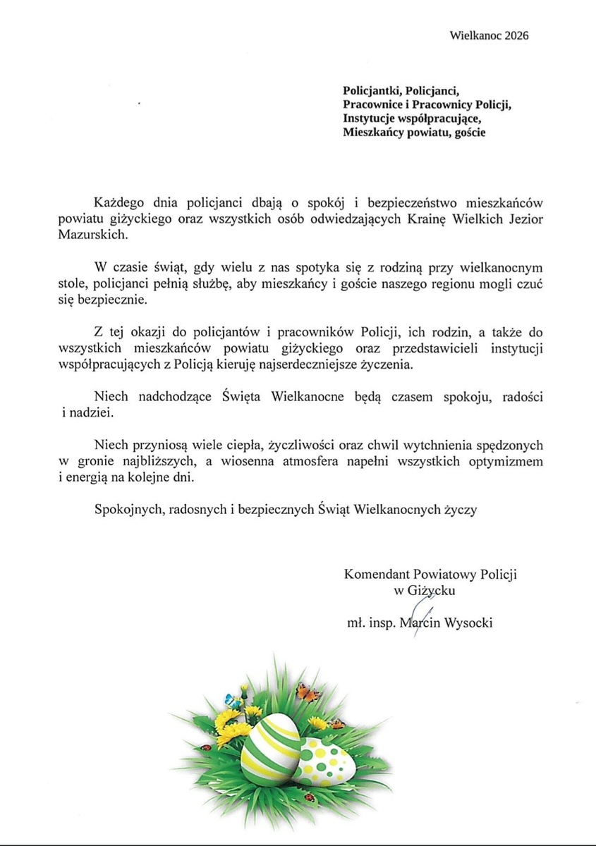 Komendant Powiatowy Policji w Giżycku mł. insp. Marcin Wysocki z okazji zbliżających się Świąt Wielkanocnych złożył najserdeczniejsze życzenia policjantom, pracownikom Policji, ich rodzinom oraz wszystkim mieszkańcom powiatu giżyckiego. Życzył spokojnych, radosnych i bezpiecznych Świąt Wielkanocnych, pełnych nadziei, życzliwości oraz chwil spędzonych w gronie najbliższych.